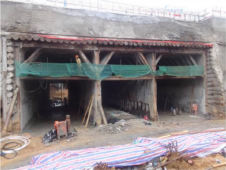 該項工程是國內第一次大規(guī)模采用小口徑鎖扣管幕,取得較圓滿的成功。該項目共施工管幕鋼管66根,其中拱部40根,側墻26根,歷時70天。拱部管幕施工精度基本能控制在10cm以內,個別超過15cm。在管幕的保護下暗挖非常順利,初支完成后總沉降3-5cm。